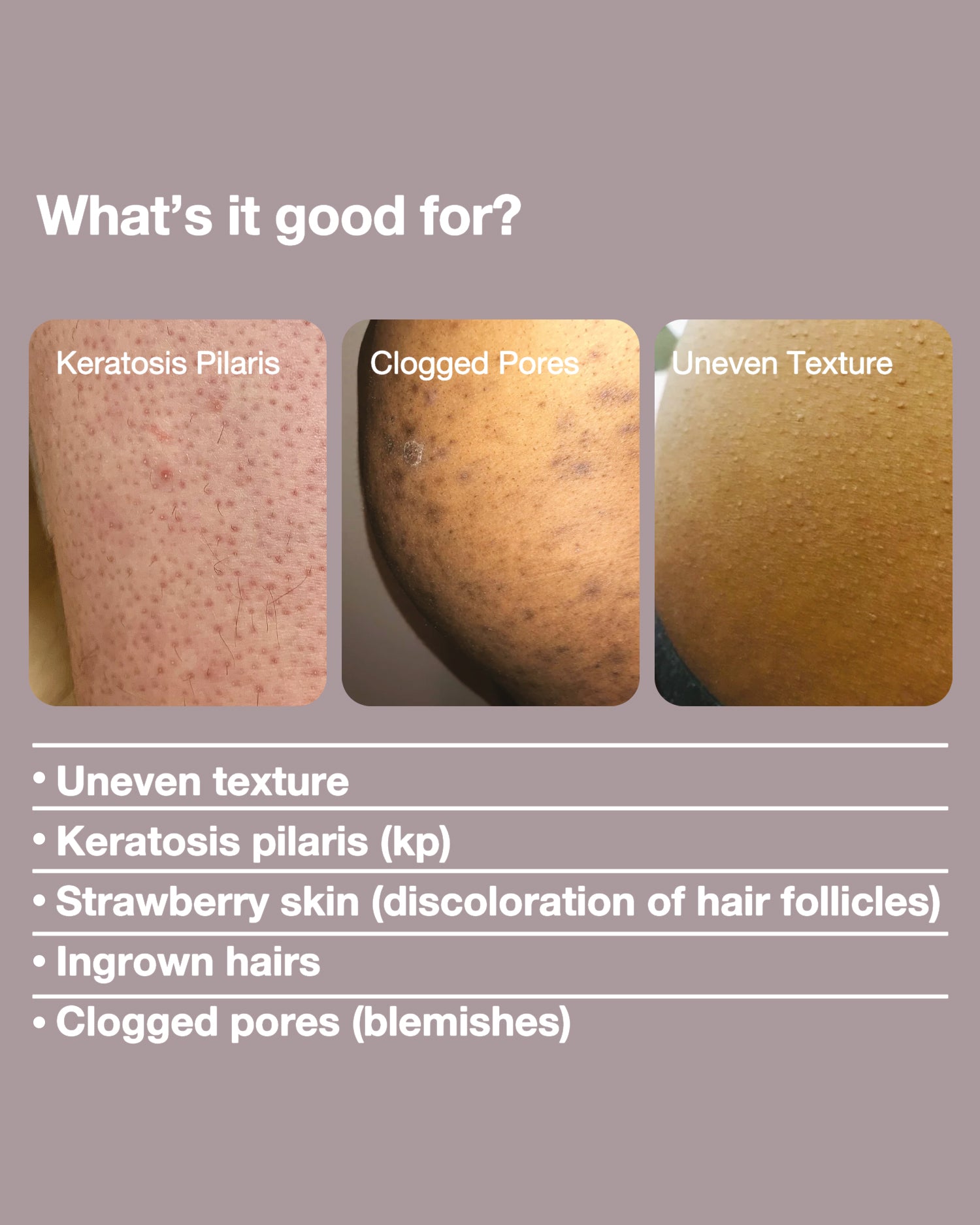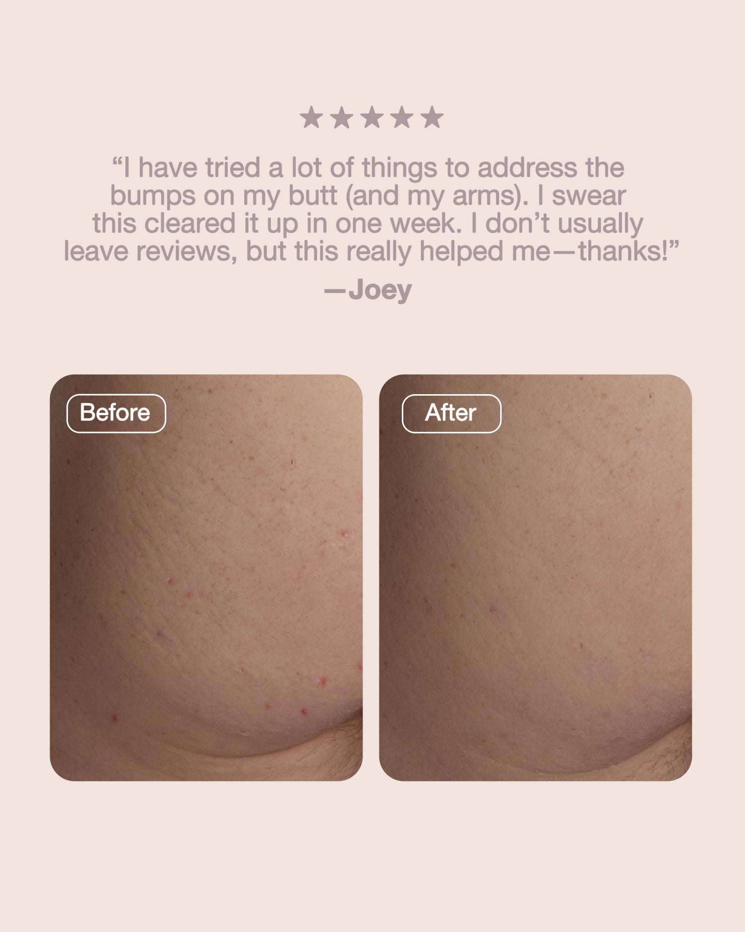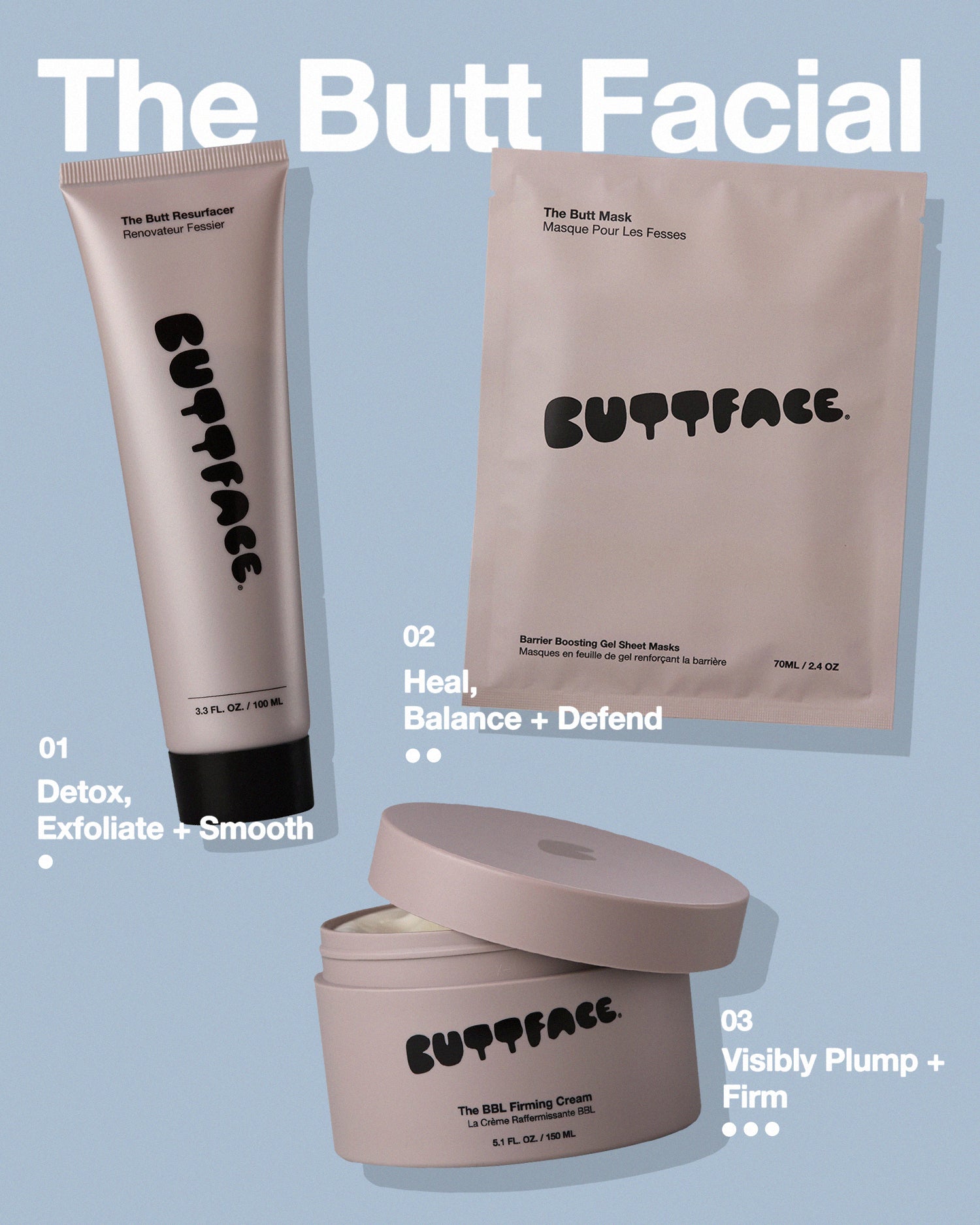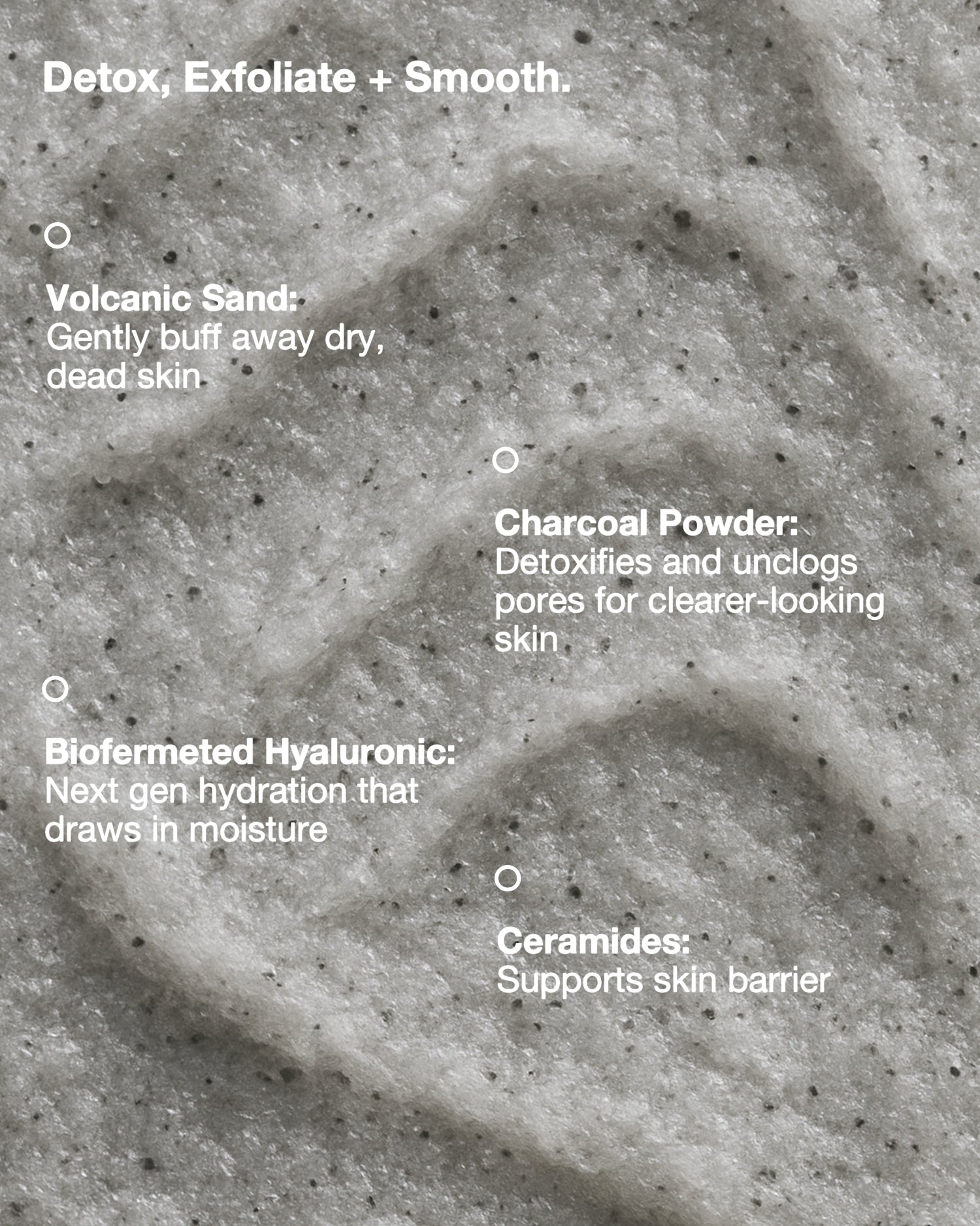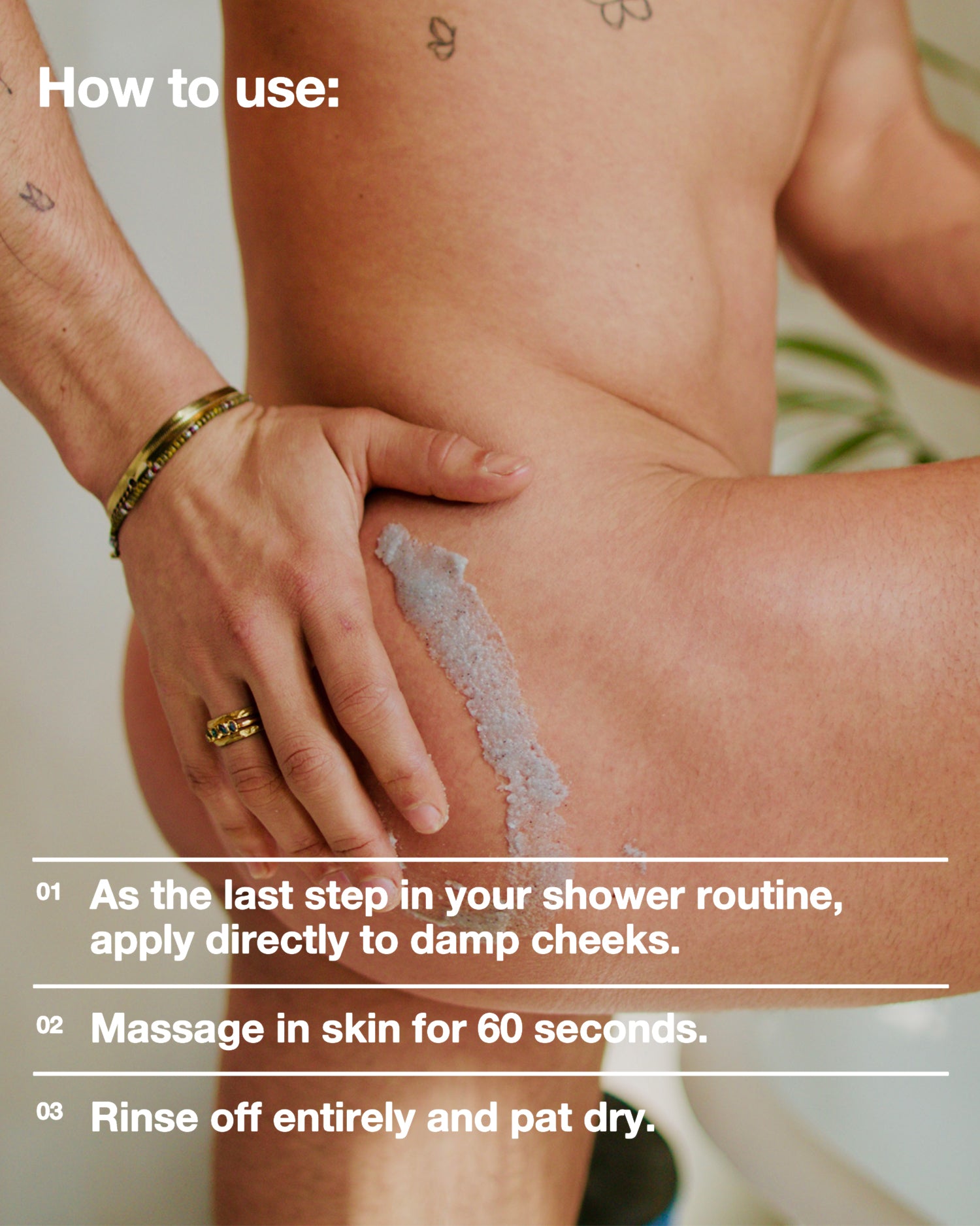 Meet The Butt Resurfacer—a facial-grade microdermabrasion treatment designed for your other cheeks. Powered by super fine high density volcanic sand, this high-performance exfoliant polishes away roughness, revealing smoother, clearer skin. Bio-fermented hyaluronic acid helps attract moisture, while squalane and prickly pear extract keep skin feeling soft, not stripped. A ceramide complex reinforces the skin barrier, and charcoal powder draws out impurities for a deep-clean feel.
